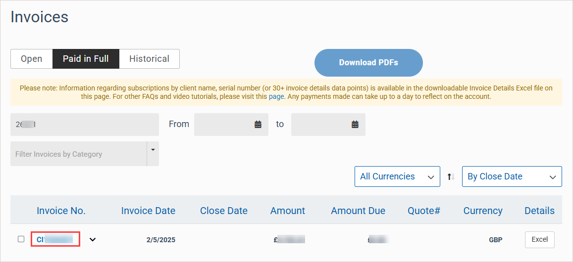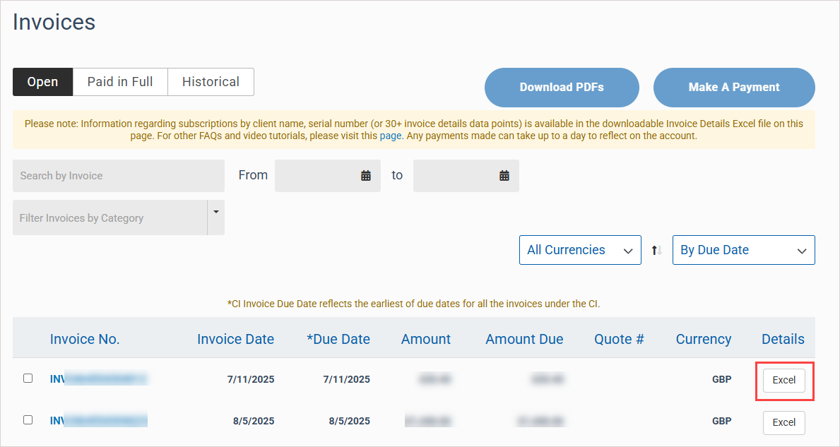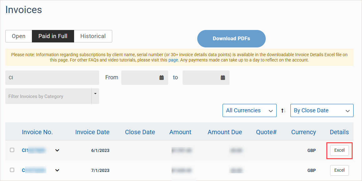 Click Invoice Details to download an Invoice Detail report in Excel format.