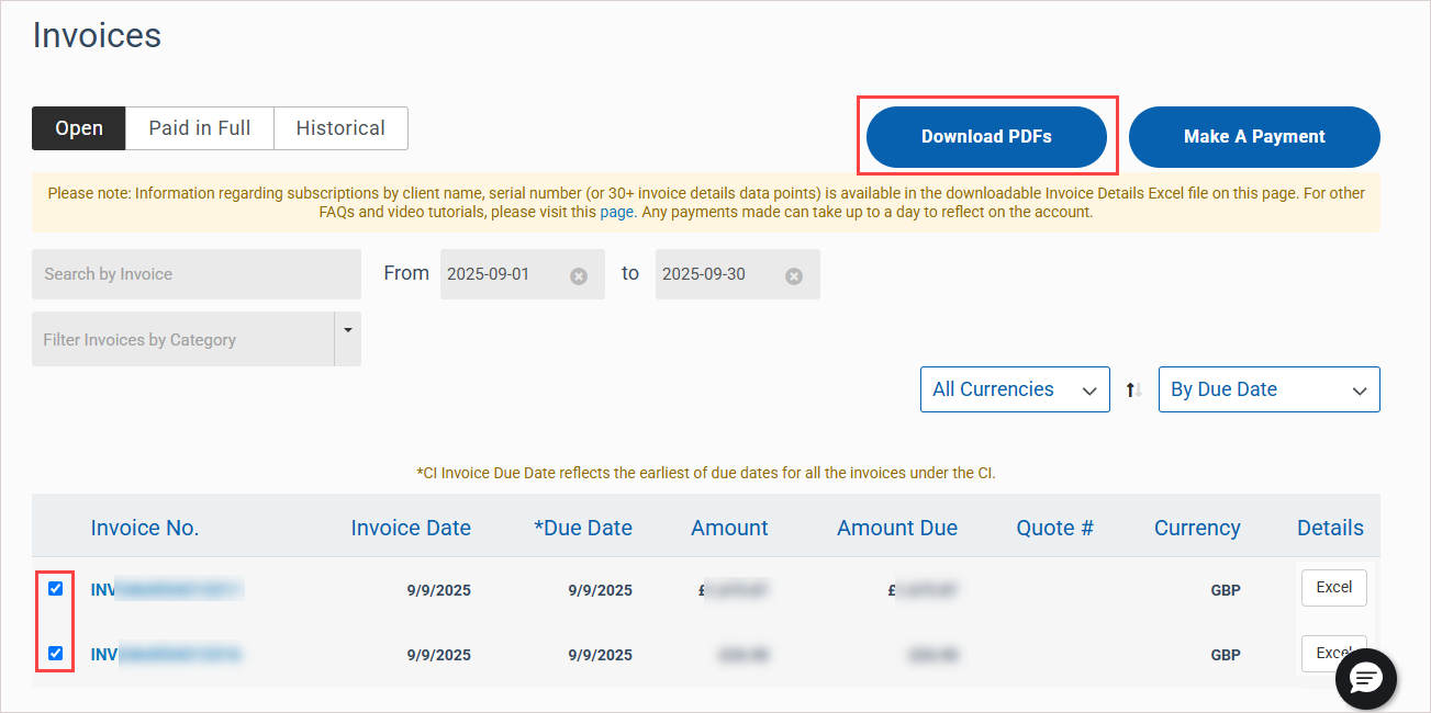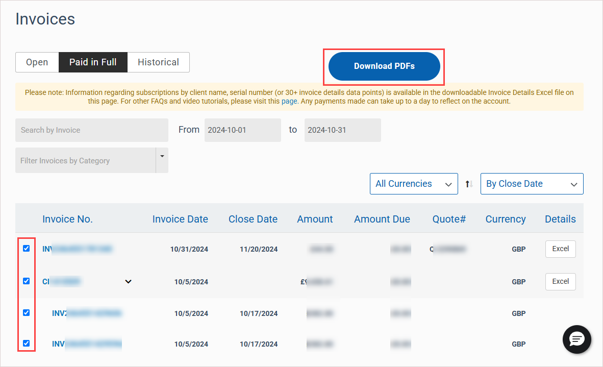 To download more PDF invoices, return to the Invoices page and either view and download a single invoice as described in the preceding step, or quickly download one or more invoices as follows: