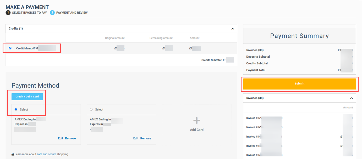 In the Payment and Review step, choose how you will pay the invoices by selecting one or more credits, a payment method, or a combination of both. Then click Submit.