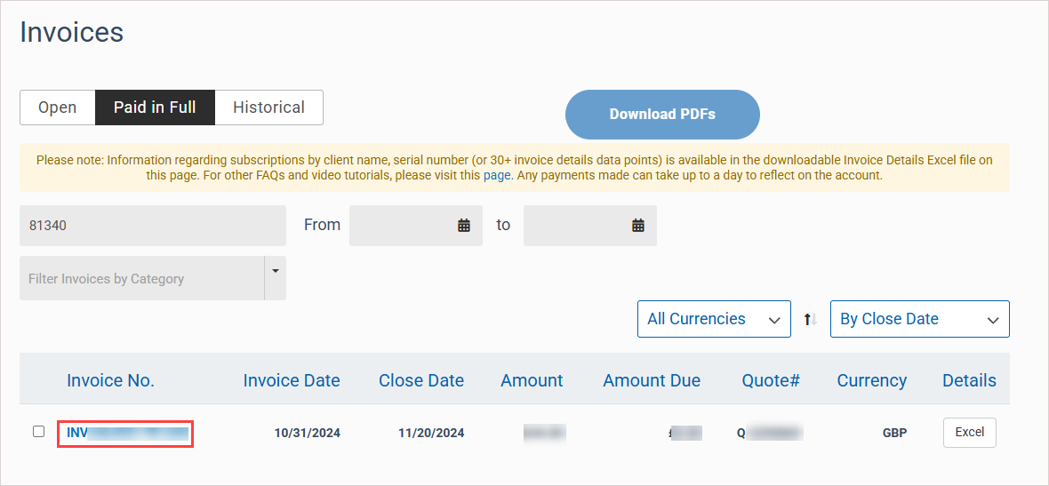 To view or download an invoice, click its PDF button. The invoice displays in PDF format in a separate browser tab. To download a copy of the invoice, click your browser's download button.
