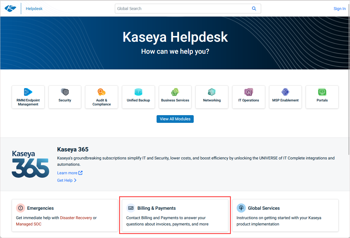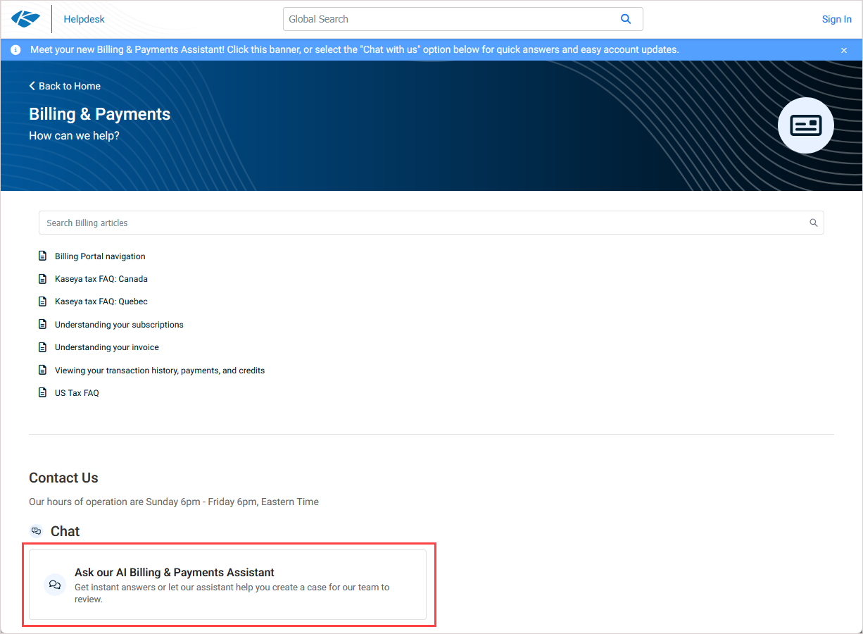 In Kaseya Helpdesk, click Billing and Payments. On the Billing and Payments page, click Ask our AI Billing & Payments Assistant.