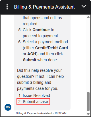 To submit a billing ticket, launch the Billing and Payments Assistant by clicking the chat icon in the lower-right corner of any billing page.