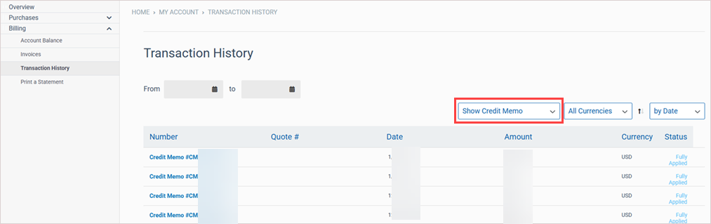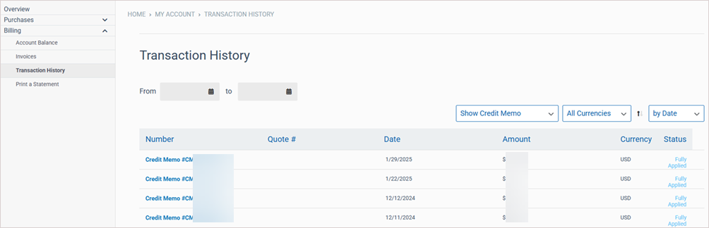 Steps to review your transactions are given in the following procedure. See the example that follows to see how to view payments and credits in your transaction history and apply credits to open invoices.