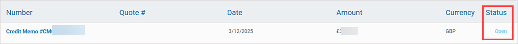 If a credit memo has not been used or applied towards paying an invoice, the status of that credit memo will be Open. An open credit memo can be applied to an invoice, as shown in the remaining steps in this example.