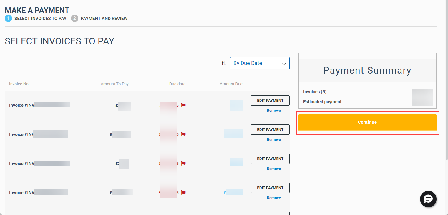 In the Select Invoices to Pay step, review the invoice details and edit as required. Then Click Continue to proceed.