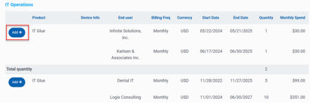 Click the down arrow in the last column to view additional details, including the product name, start and end dates for the subscription, quantity, monthly amount, and billing frequency per subscription.