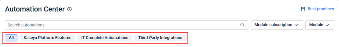 - IT Complete Automations: Filters the results to display only automations that are powered by integrations between Kaseya modules.