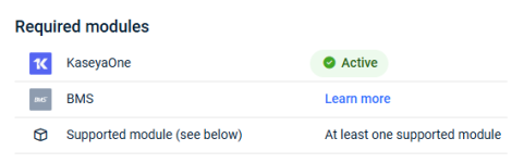 To leverage a platform feature, you must be subscribed to the module that hosts it and to at least one integrated module the feature supports. Modules included in platform features must be connected to KaseyaOne.