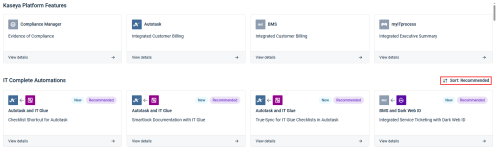 By default, Kaseya Platform Features are sorted in a set order. IT Complete Automations and Third-Party Integrations are sorted by recommended options, then by newest options.