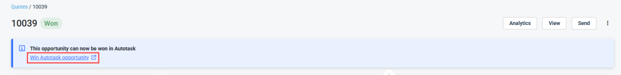 Once a quote that is associated with an Autotask opportunity is won in Kaseya Quote Manager, click Win Autotask opportunity at the top of the quote to launch the Won Opportunity Wizard in Autotask.