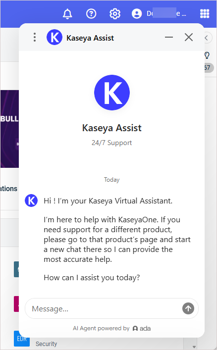 Kaseya Assist is a 24/7 support chatbot that is now available directly within KaseyaOne, enabling you to quickly get answers to basic questions without leaving the application. This enhancement reduces the need to search external documentation or contact support, saving you time and minimizing disruptions. If your question requires more in-depth help, you can easily connect with a live support agent, ensuring you receive the assistance you need when you need it.
