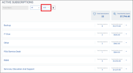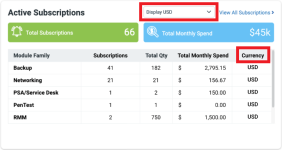 The Monthly Cost has been removed from the Subscriptions widget on the Home and Subscriptions & Billing pages and also from the Active Subscriptions list on the Subscriptions & Billing page. Clicking the new View Subscription Details and Monthly Costs button brings you to the Kaseya Store's Active Subscriptions page where you can review an itemized list and total monthly spend.