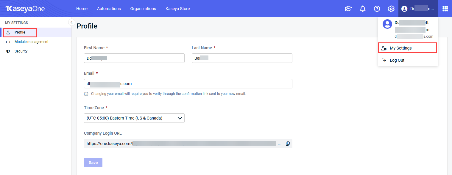 On the Profile page, the First Name, Last Name, Email, and Time Zone values currently associated with your KaseyaOne user account are prepopulated and editable. If you edit any of your profile details, click Save.