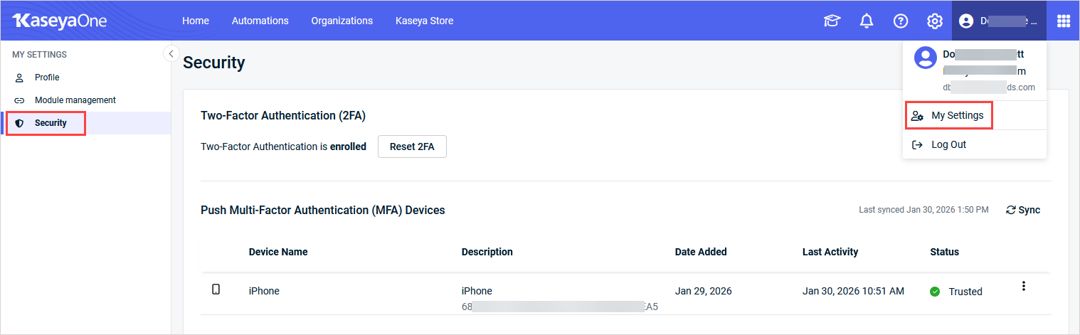The Security page allows you to reset the two-factor authentication settings for your account, enable push MFA for your KaseyaOne account, and add devices for push MFA authentication.
