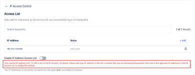- A note in red will indicate if your current IP address is not yet added to the allowlist. To configure and enable this feature, you must add your current IP address, which prevents you from inadvertently blocking your own access to your KaseyaOne account.