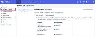 The Kaseya 365 Setup Guide page in KaseyaOne provides customized onboarding steps for each new Kaseya 365 subscription purchased for your KaseyaOne account. Click Kaseya 365 Endpoint to view the steps you will follow to set up your subscription.