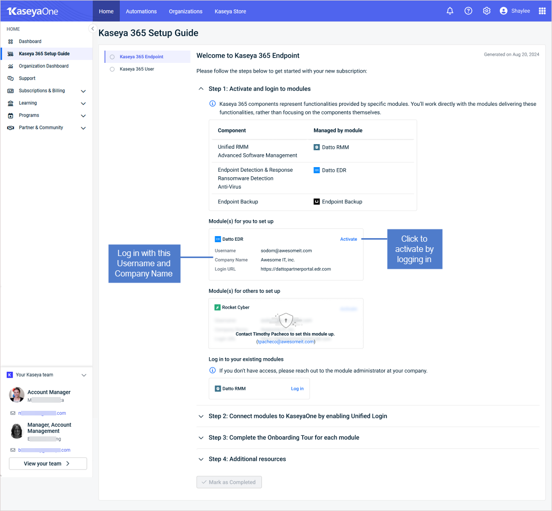 - Step 1: Activate and log in to modules: Each new module has a designated implementation contact who must activate that module. All KaseyaOne Master users can view this step in the guide, but functionality is limited if you are not the module’s designated implementation contact.