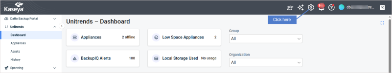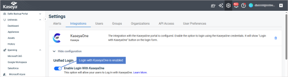 NOTE If you are new to Spanning Backup, Enable Log In with KaseyaOne is enabled automatically with your Kaseya 365 subscription. To view this setting in the UniView Portal, click |