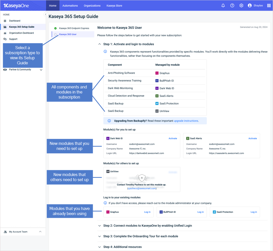 Modules that were newly provisioned for this subscription display in these sections under Step 1 on the Kaseya 365 Setup Guide page: Module(s) for you to set up and Module(s) for others to set up. Each new module must be set up by its designated implementation contact.