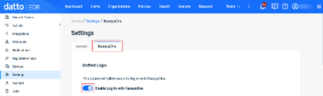 On the Settings page, click the KaseyaOne tab. Verify Log In with KaseyaOne is turned on.