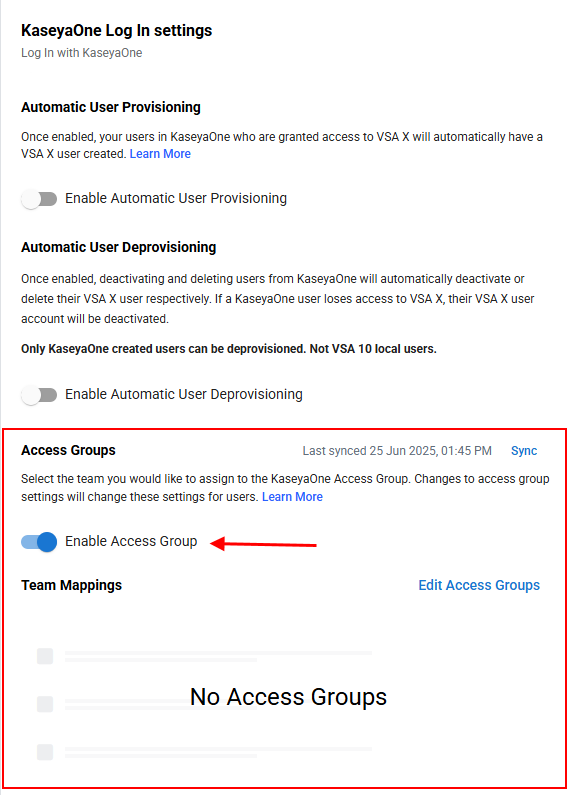 If you enable Access Groups, then RBAC from KaseyaOne will be allowed for the module and you will be able define mapping rules (by mapping KaseyaOne groups to the same or similar module roles) to control user access.
