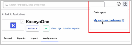 You can test your Okta SSO integration by logging in from either the Okta interface (IdP-initiated login) or the KaseyaOne login page (SP-initiated login).