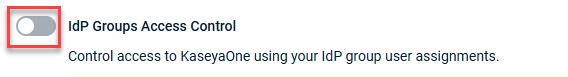 - IdP Groups Access Control to control access to KaseyaOne using your IdP group user assignments. Refer to Configure third-party IdP Groups Access Control in KaseyaOne.