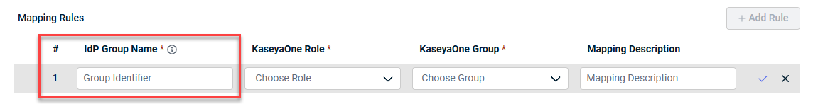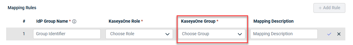 IMPORTANT If a user does not belong to the IdP group or the IdP group is not defined in the Mapping Rules, the user's KaseyaOne account will be deactivated and revoked access to KaseyaOne.