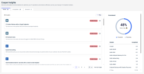 The list of Cooper insights is grouped into tabs based on the insight statuses: To Do, Completed, or Snoozed. The Scoreboard section shows your progress in completing the insights.