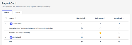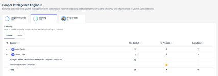 Track how you or your employees are progressing through Kaseya University courses through learning insights driven by Cooper Intelligence Engine.