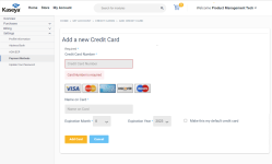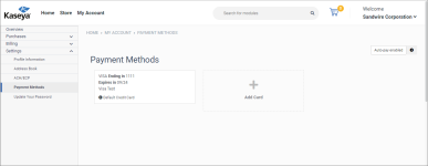 In Kaseya Store, navigate to My Account > Settings > Payment Methods, where you can manage the payment methods for your account. From this page, you can do the following:
