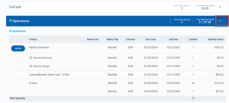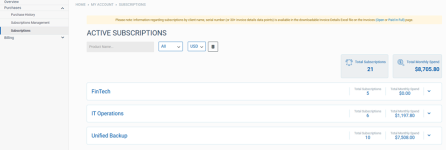 Click the down arrow in the last column to view additional details, including the product name, start and end dates for the subscription, quantity, monthly amount, and billing frequency per subscription.