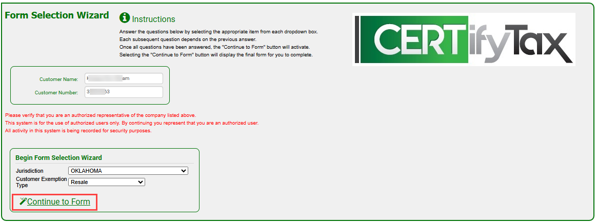 On the Form Selection Wizard page, select your jurisdiction and other items from each dropdown list, then click Continue to Form.