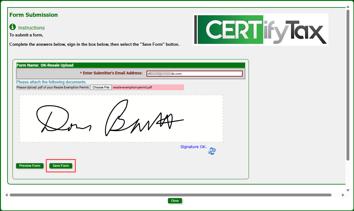 On the Form Submission page, enter your email address, upload your exemption certificate, sign in the box below, then click Save Form to submit the form.