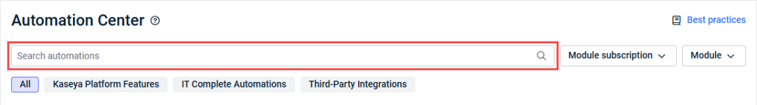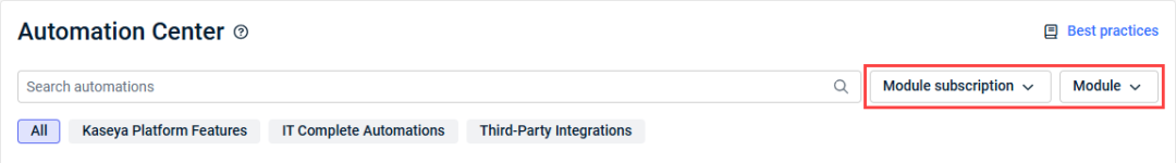 - IT Complete Automations: Filters the results to display only automations that are powered by integrations between Kaseya modules.