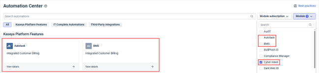 NOTE When you filter by module, the Automation Center includes supported modules for platform features in the results. If you filter by Cyber Hawk, for example, the Autotask and BMS Integrated Customer Billing platform features are displayed because Cyber Hawk is a supported module for that feature.