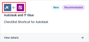 - IT Complete Automations cards display the logos of the two integrated Kaseya modules that power the automation, the names of the two modules, and the name of the automation. The home module appears on the left, and the supporting module appears on the right.