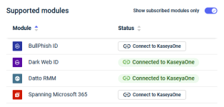 - See which modules are connected to KaseyaOne and which are not, and conveniently navigate to instructions for connecting owned modules to KaseyaOne via Unified Login.