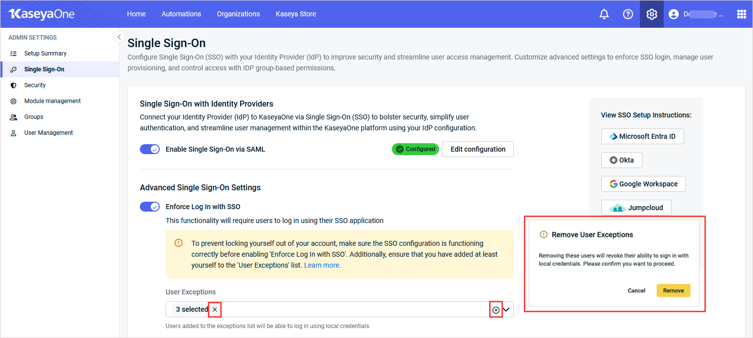 We’ve added a confirmation prompt when removing users from the SSO exceptions list in KaseyaOne. This change helps prevent accidental removals when enforcing third-party SSO across your organization.