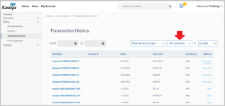 Credit memos and payments now appear on the Transaction History page when the Show all record types filter is selected. Selecting the Show Credit Memo filter shows only credit memo records. Selecting the Show Payment filter shows only payment records.